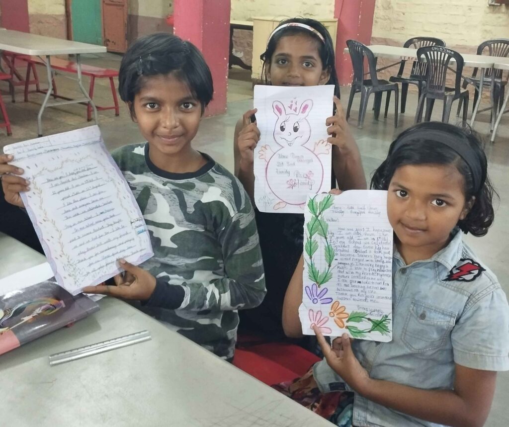 This feeling is experienced at Mukti Mission in a slightly different way. Each year the LIFEgiver sponsorship team at Mukti prepares mailings for all of our LIFEgivers. Labels are printed, applied to a card, and then given to the residents to write or draw a personal message to their LIFEgiver.